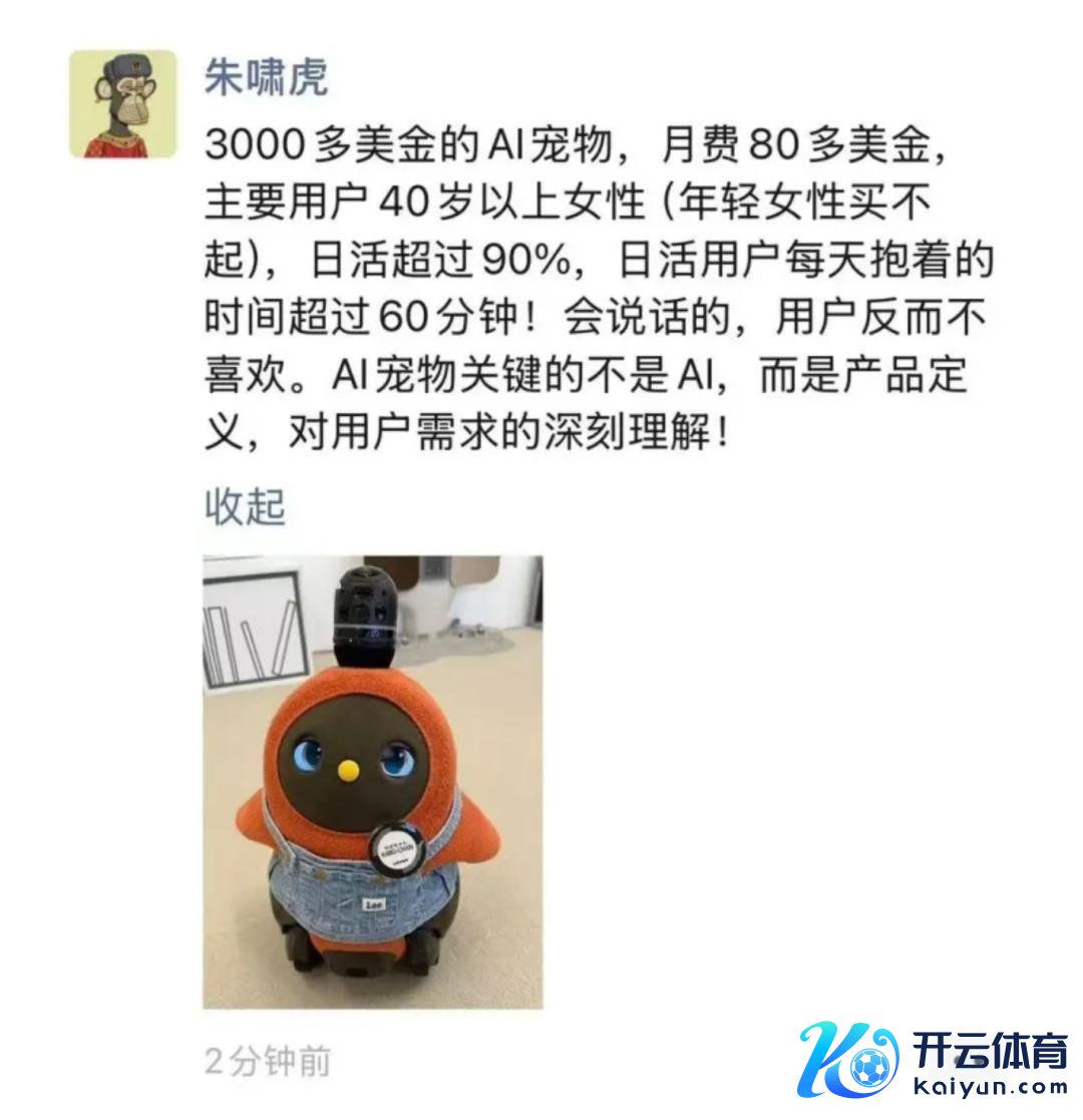 基于对“热诚价值”的更高需求,女性浮滥者成为陪伴类家具浮滥的主力军。前段时候,网传朱啸虎在一又友圈共享日本陪伴机器东谈主LOVOT的业务模式,他暗示:3000多好意思金的AI宠物,月费80多好意思金,主要用户40岁以上女性(年青女性买不起),日活跳跃90%,日活用户每天抱着的时候跳跃60分钟!会语言的,用户反而不心爱。AI宠物要道的不是AI,而是家具定位,对用户需求的潜入相识!